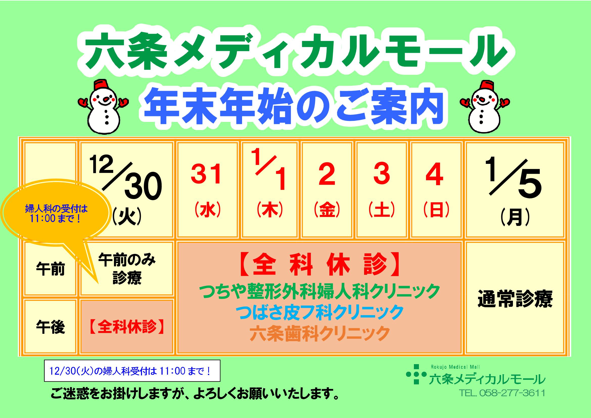 12月30日(火)の婦人科受付は11:00まで!